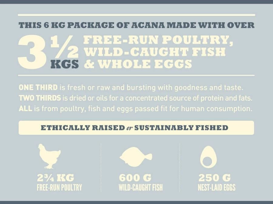 Exempt de céréales et de glucides à absorption rapide, comme le riz, le tapioca et les pommes de terre, ACANA est riche est protéines animales afin de favoriser une condition physique et une santé optimales chez votre chien. Confectionné dans nos cuisines primées à partir des ingrédients les meilleurs et les plus frais au Canada, ACANA, une nourriture adaptée aux Biologically Appropriate™ des animaux de compagnie, est le meilleur moyen de garder votre chien adoré heureux, sain et fort.