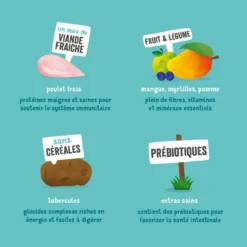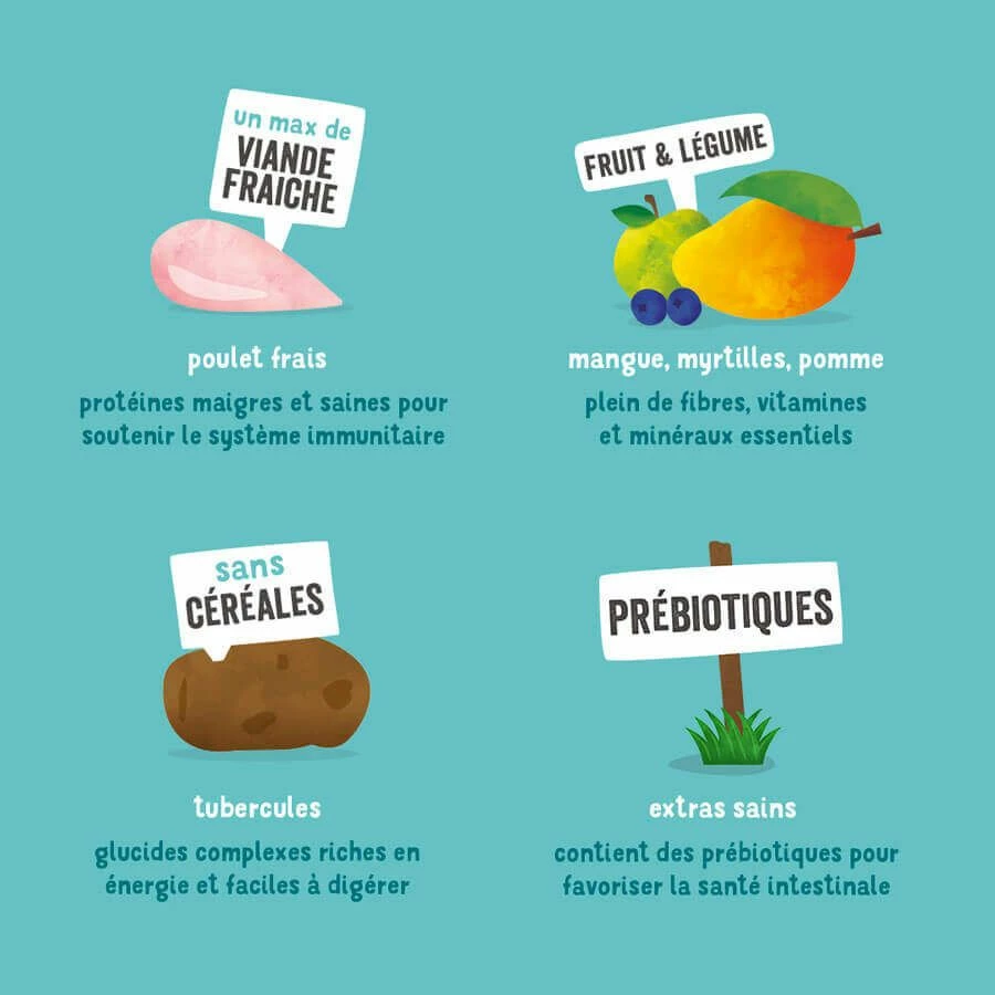 Riche en poulet frais élevé en liberté, cette recette sans céréales est une source incroyable de protéines de qualité supérieure faibles en calories (sans viande séchée ou déshydratée). Elle contient des pré-biotiques pour un intestin en bonne santé. Ces recettes incluent également un mélange super équilibré de fruits et de légumes, et des herbes et des végétaux riches en nutriments pour un coup de boost supplémentaire. Avec une cuisson douce des croquettes pour préserver leurs saveurs et leurs bienfaits.