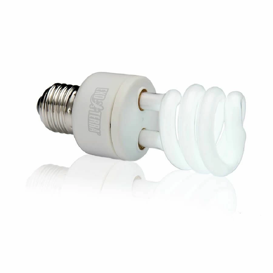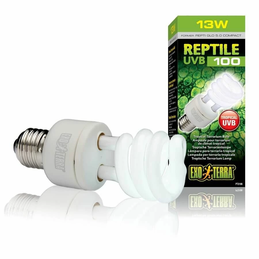 L’ampoule UVB100 de chez Exo Terra pour reptiles Ă©met un niveau maximum de rayons UVB, semblable Ă celui des milieux ombragĂ©s que l’on retrouve dans un climat tropical humide ou dans tout autre climat tropical.