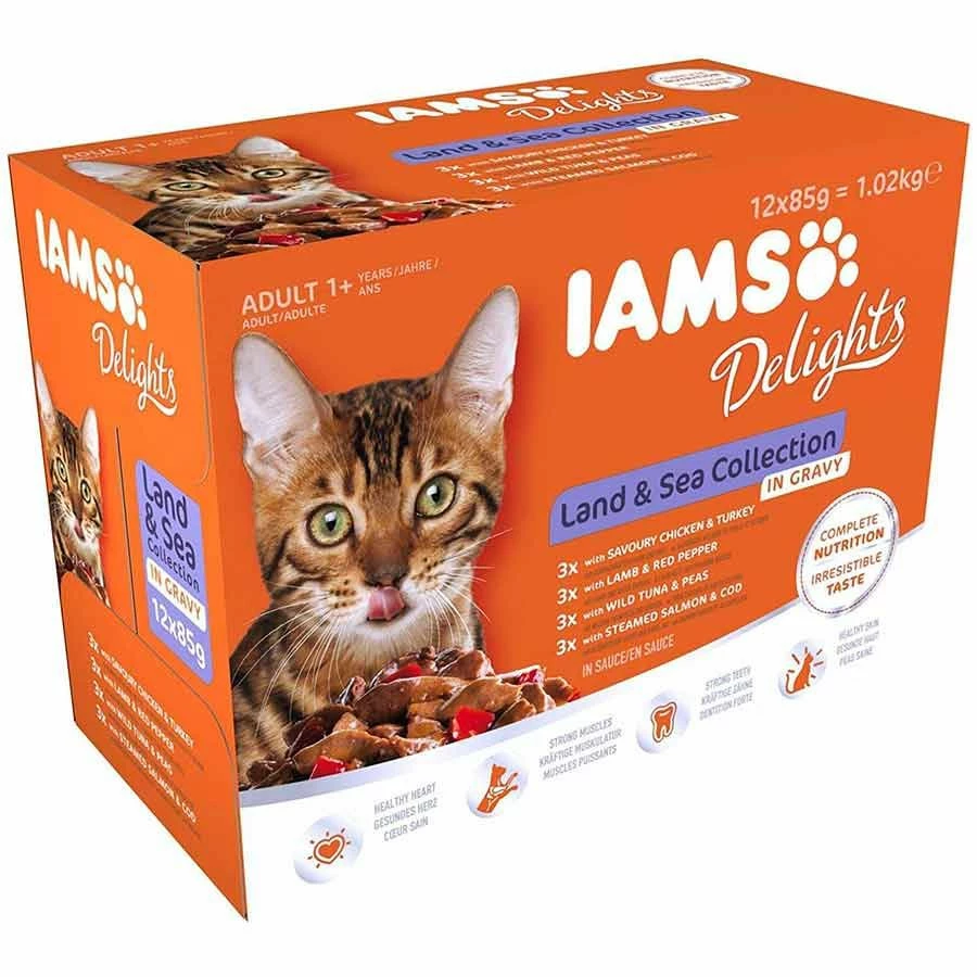 Les sachets fraîcheur « Terre et Mer » en sauce de chez Iams Delight offrent une alimentation complète et équilibrée. Cette nutrition humide à base de protéines de haute qualité a été spécialement élaborée pour les chats.