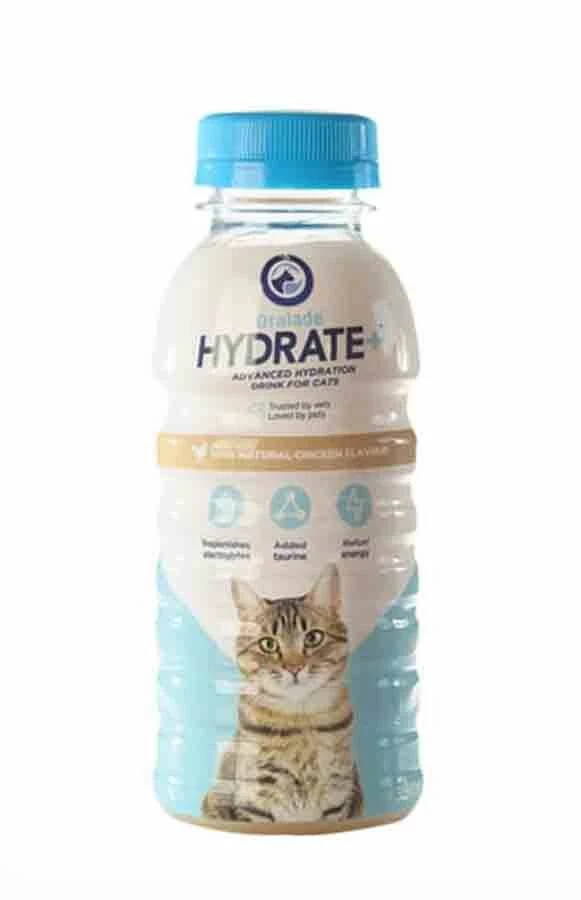 Oralade® Hydrate + encourage les chats Ă boire facilement pendant les periodes de stress, voyages, temps chaud, transition alimentaire, problèmes rĂ©naux et urinaires …
