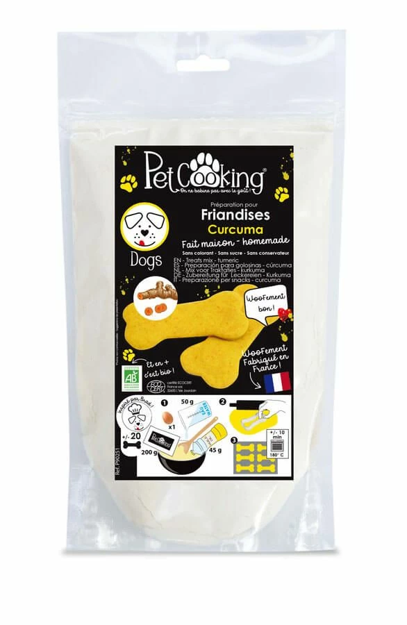 Cette préparation pour friandises PetCooking vous permettra de cuisiner de délicieux biscuits au curcuma pour votre chien. Une composition saine avec des produits Bio !