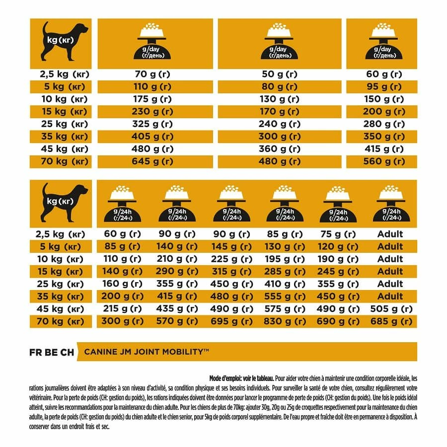 Les croquettes Purina Proplan Chien Joint Mobility peuvent ĂȘtre Ă©galement utilisĂ©es dans le cadre d’un rĂ©gime amaigrissant ; son rapport protĂ©ines/calories Ă©levĂ© et sa teneur rĂ©duite en matiĂšres grasses permettent d’obtenir et de conserver un Ă©tat corporel idĂ©al et de soulager ainsi les articulations ; les Ă©tudes ont montrĂ© que cette alimentation au quotidien permettait d’amĂ©liorer la mobilitĂ© des races aux articulations fragiles.