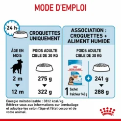 Cette nutrition est indiquée pour les chiots, âgés de 2 à 15 mois, dont le poids adulte est compris entre 26 et 44 kg.