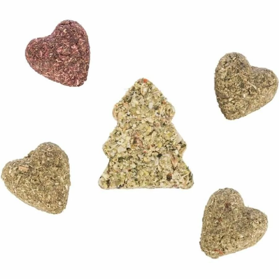 Il y a 9 variétés différentes de friandises dans ce calendrier : anneau au biscuit, bonbons au pissenlit, bonbons au luzerne, biscuit au légumes, friandise naturelle coeur, friandise naturelle avec betterave rouge, banana chips, chips de carottes, morceaux de betterave rouge.