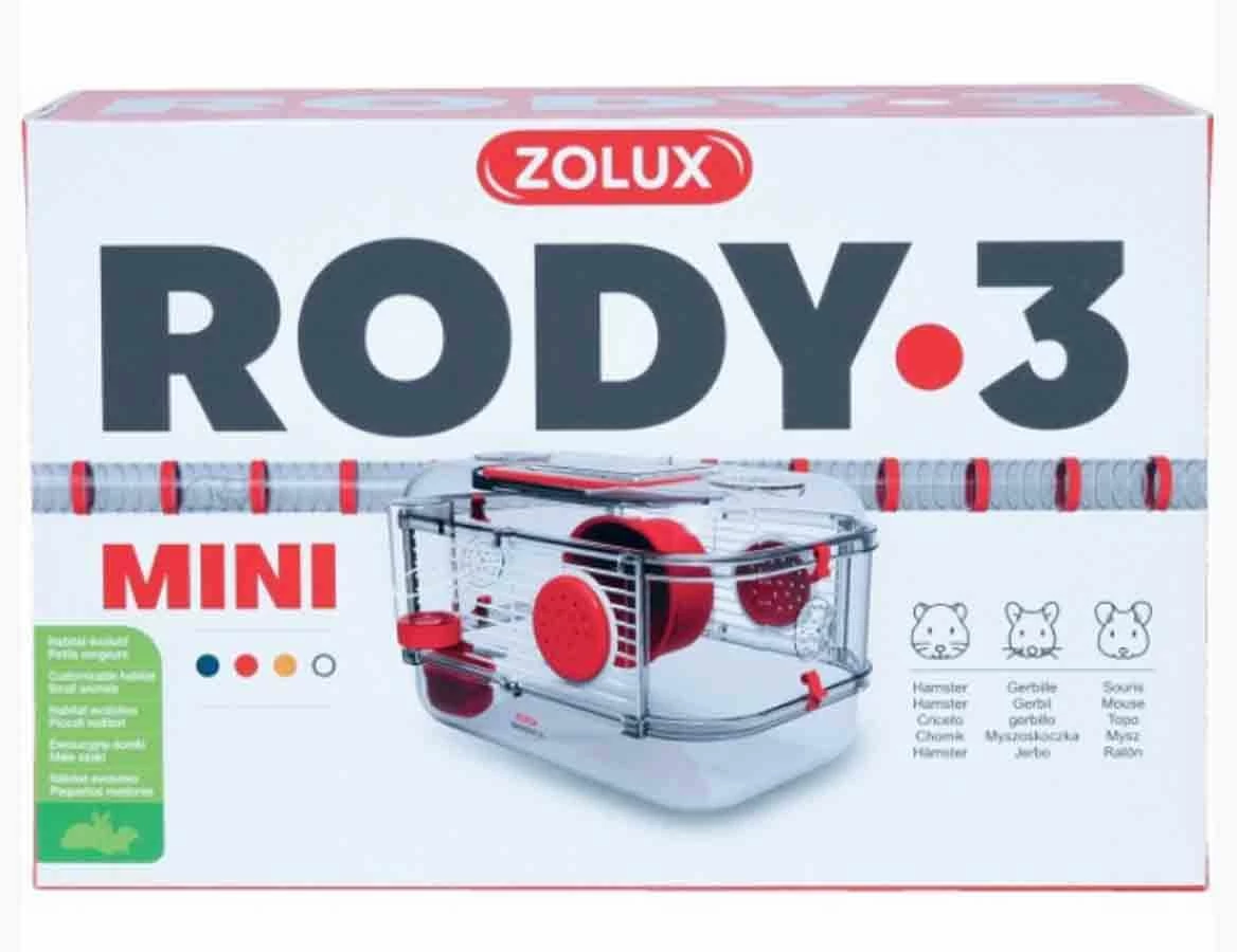 La cage RODY 3 mini de chez Zolux est un habitat Ă©volutif pour petits rongeurs (hamsters, souris et gerbilles), la nouvelle gamme RODY.3 offre un nouveau design avec un nouveau fond et dessus de cage, ainsi qu’un plastique lĂ©gèrement gris fumĂ©.